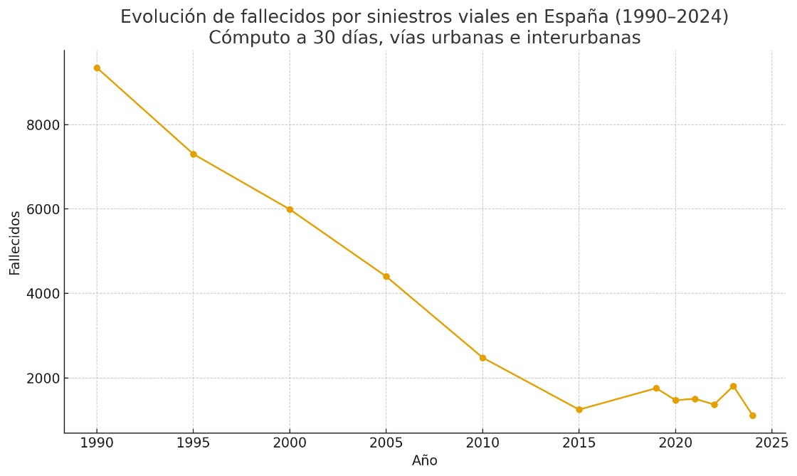 Y fue precisamente desde el año del nacimiento de Aesleme, cuando comienza el cambio radical hasta alcanzar una caida del 50% de la mortalidad a principios de los años 2000 -en los que aún perdían la vida más de 4 mil personas- y lograr una mejora histórica como sociedad, a partir de 2010, con un año como referencia: 2023, que marcó el mínimo histórico (1680 fallecidos). Nada como un gráfico para comprender esta mejora radical de la que hablamos: